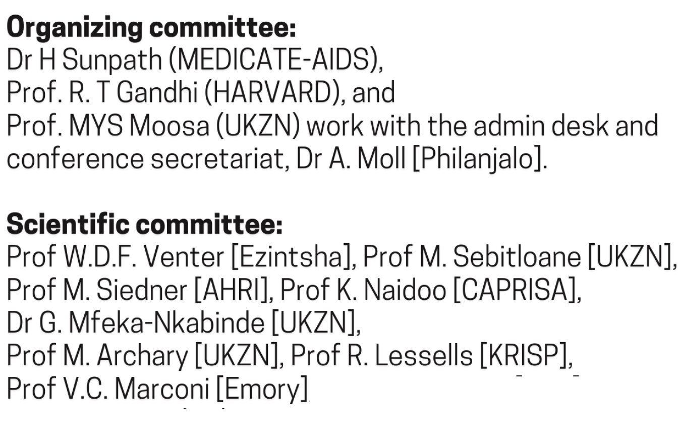 Dr Henry Sunpath (Chairperson) Dr. Raj Gandhi (ID Unit Mass General Hospital, Harvard Medical School)Prof MYS Moosa (ID Unit, NRMSM at UKZN)